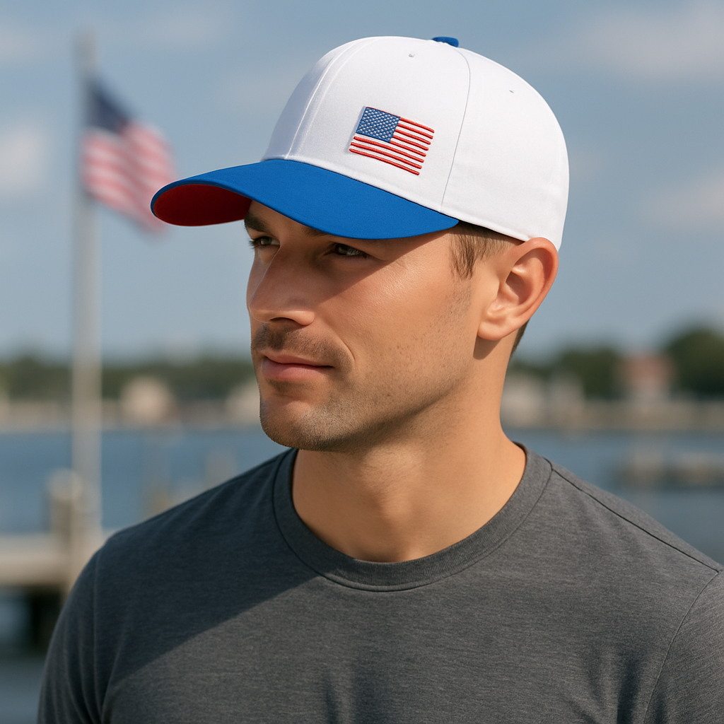 Simple, clean, and proudly American. This hat features a soft white woven fabric paired with a blue curved bill, and a high-quality embroidered USA flag patch on the front. It’s a classic everyday hat that’s easy to wear and easy to match.